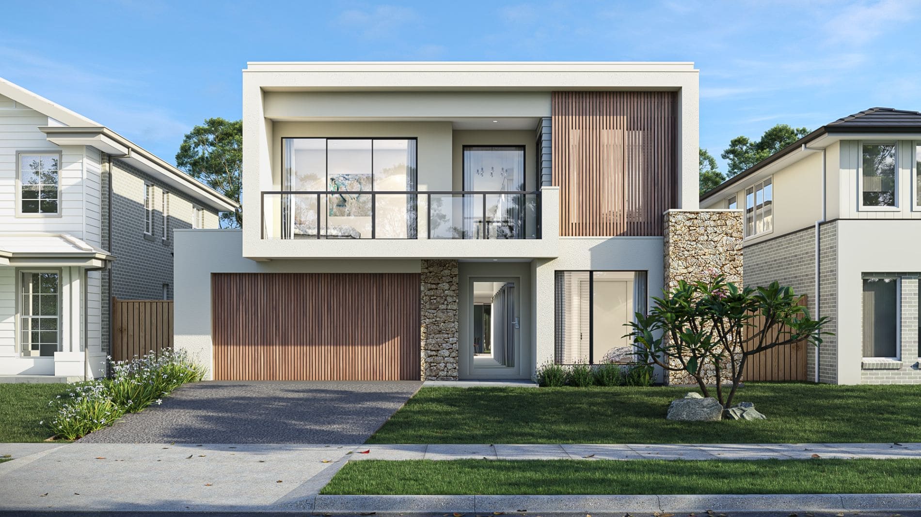 The facade of the Lumina showcases a modern twist with a concealed garage door, cleverly designed with timber slats for a blend of privacy and style. Optional glass balustrading offers sleek lines and clear views, adding to the home’s modern appeal.